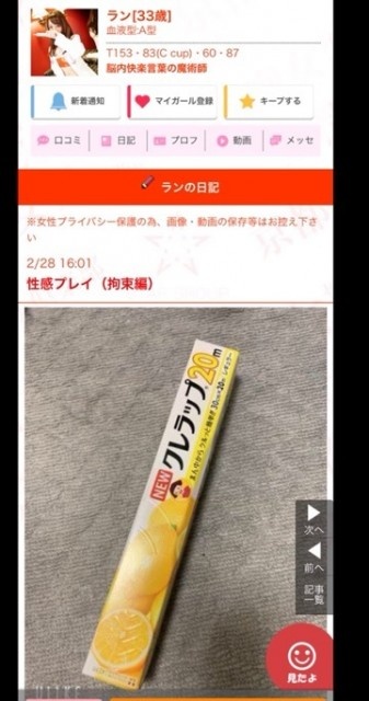 2月28日のランちゃんの 写メ日記にて わたくし大発見をしてしまいました ランちゃんて・・・ ![]() クレラップ派?! わたくし ![]() サランラップ派! 昔ながらの 旭化成に愛着あるんよねー って 「どーでもええわ」と ランちゃんに突っ込まれそう いや、 ほんっとどうでもいい 笑笑 まっ2人とも人体に使用なんだけどね ![]() 今度どちらの流派がピッタリフィットするのか3Pで試したいね ![]() そしてこうして さらに圧迫!!!したい願望 では おとなしく寝ます ![]() ![]() お休みなさい セラ ![]()