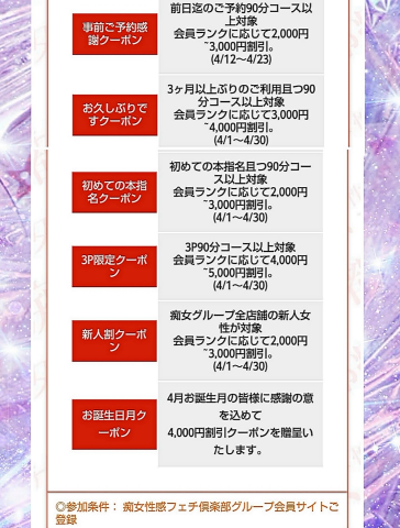 アナタの…… お得だよんッ ↓↓↓↓↓↓↓ 4月は どっさりクーポン祭りッ ![]() お連れ様とご一緒なら お得な割引のご利用を… 詳しくはstaffへどうぞッ ヘブンで ネット予約ッ もぅ知ってるよねッ()ノ アナタのスケジュールと 合えばいいなッ (ω)出勤 予定 デ〜スッ 18(日) 11:00 〜 18:00 19(月) お休みいただきます♪ 20(火) 11:00 〜 18:00 21(水) 11:00 〜 18:00 22(木) お休みいただきます♪ 23(金) お休みいただきます♪ 24(土) 11:00 〜 18:00 お時間 合えば…遊んでくださいなッ♪ ![]()